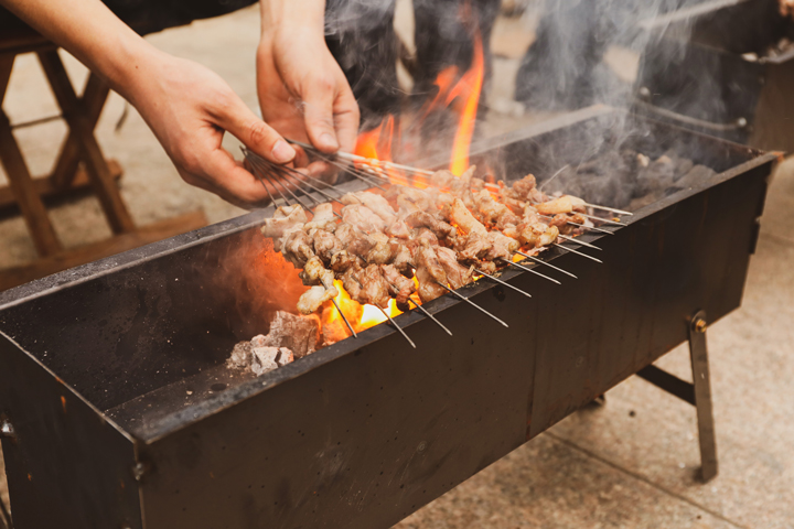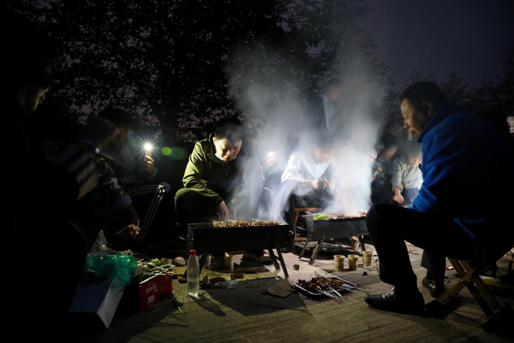 每一块羊肉都经过了无数次的翻动,在四五份熟时,刷上一次油、一层料,料汁滴进火中,“呲呲”作响,肉香扑鼻,浓郁的烟火气延缓了傍晚山里冷空气的侵袭。