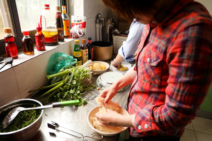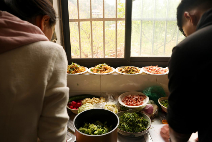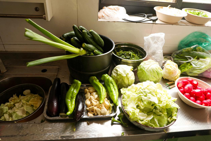 原本空荡荡的厨房,被同事们带来的柴米油盐和锅碗瓢盆塞进了满满的烟火气。洗菜组最先行动起来,虽然只有一个洗菜池,但每样菜都被安排好了清洗顺序,不大的厨房里井然有序的开工着。
