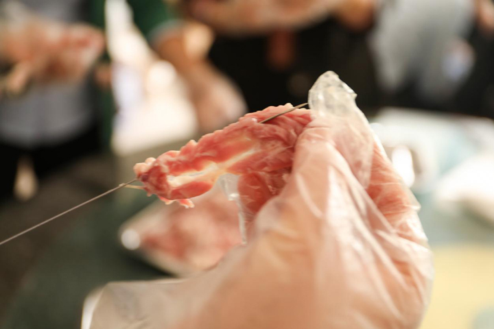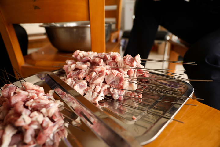 厨房里上演着“交响乐”,大厅里忙碌着的串肉组也手脑并用,在尝试中寻找最快的串肉方法。经过几个人的配合,半个多小时就串好了满满几盘肉串。